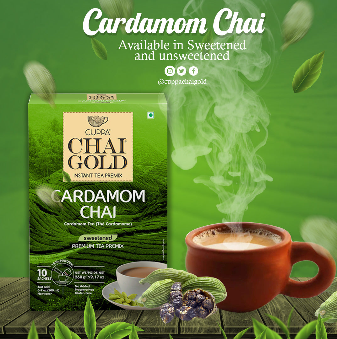 Enjoy a refreshing cup of traditional Indian chai with Chai Gold's all natural instant Cardamom Tea Sweetened. At Cuppa Chai Gold, we focus on quality, consistency, and convenience of our products. Relish your next cup of tea at home, office or while on the go!